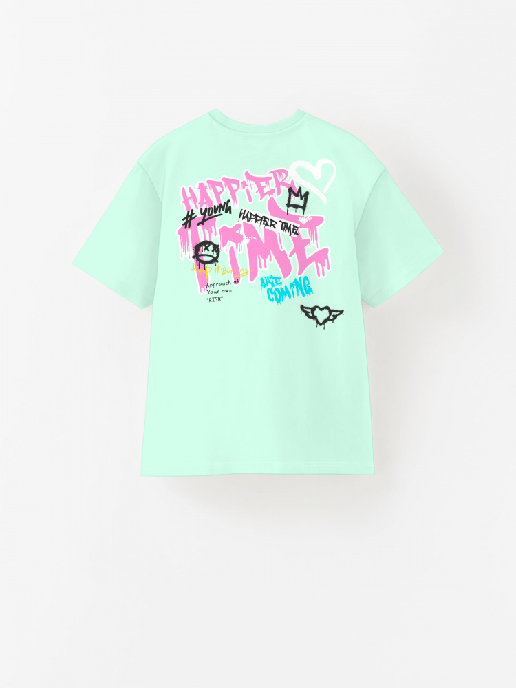 Яркая футболка из хлопка с тематическим принтом. Модель прямого силуэта. Футболка идеально подойдет для повседневной носки. Мягкий хлопок обладает приятными тактильными свойствами, а яркий принт не выцветает и совершенно не ощутим. Благодаря уникальной технологии печати по ткани - яркий принт не потрескается и не полиняет! Все используемые краски для печати принта безопасные и экологичные и сохраняют воздухопроницаемость ткани.