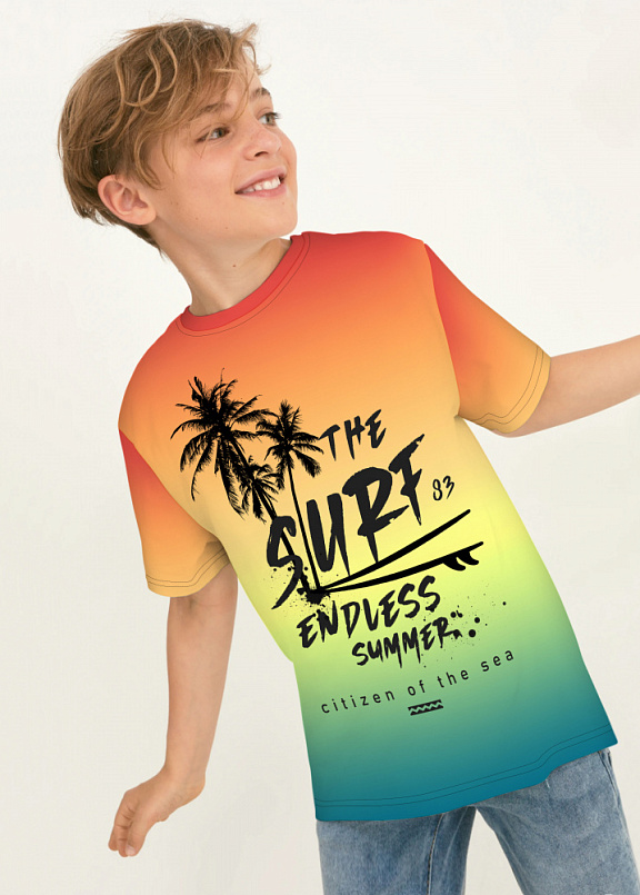 Яркая футболка из хлопка с тематическим принтом. Модель прямого силуэта. Футболка идеально подойдет для повседневной носки. Мягкий хлопок обладает приятными тактильными свойствами, а яркий принт не выцветает и совершенно не ощутим. Благодаря уникальной технологии печати по ткани - яркий принт не потрескается и не полиняет! Все используемые краски для печати принта безопасные и экологичные и сохраняют воздухопроницаемость ткани.