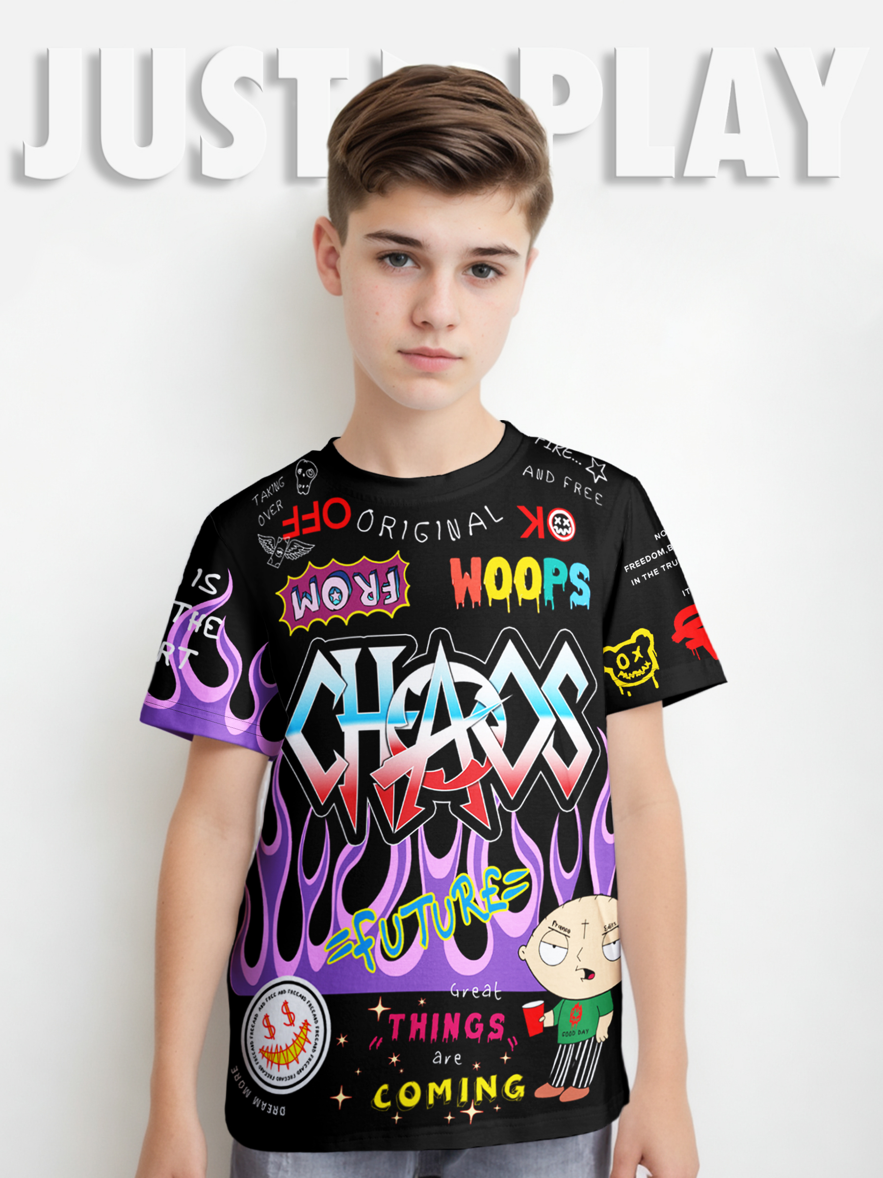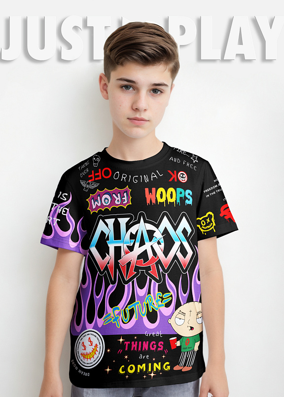 Яркая футболка из хлопка с тематическим принтом. Модель прямого силуэта. Футболка идеально подойдет для повседневной носки. Мягкий хлопок обладает приятными тактильными свойствами, а яркий принт не выцветает и совершенно не ощутим. Благодаря уникальной технологии печати по ткани - яркий принт не потрескается и не полиняет! Все используемые краски для печати принта безопасные и экологичные и сохраняют воздухопроницаемость ткани.