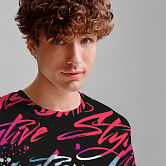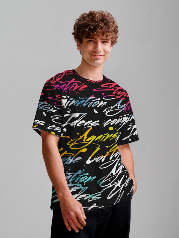 Стильная футболка из хлопка c оригинальным принтом по всей поверхности. Футболка идеально подойдет для повседневной носки. Мягкий хлопок обладает приятными тактильными свойствами, а яркий принт не выцветает и совершенно не ощутим. Все используемые краски для печати принта безопасные и экологичные.