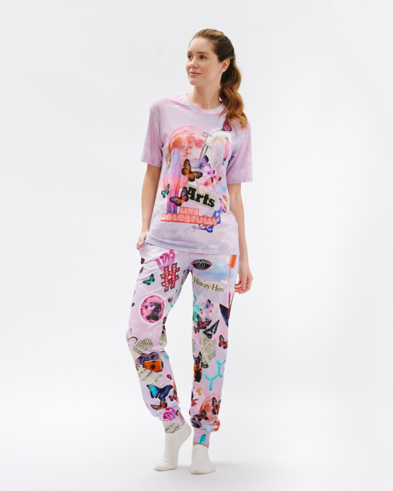 Стильный комплект c ярким тематическим принтом из хлопка. Состоит из футболки прямого силуэта и брюк с манжетой. Комплект можно использовать как домашний костюм или пижаму. Мягкий хлопок обладает приятными тактильными свойствами, а яркий принт совершенно не ощутим, благодаря уникальной технологии печати по ткани. Все используемые краски для печати принта безопасные и экологичные и позволяют ткани дышать.