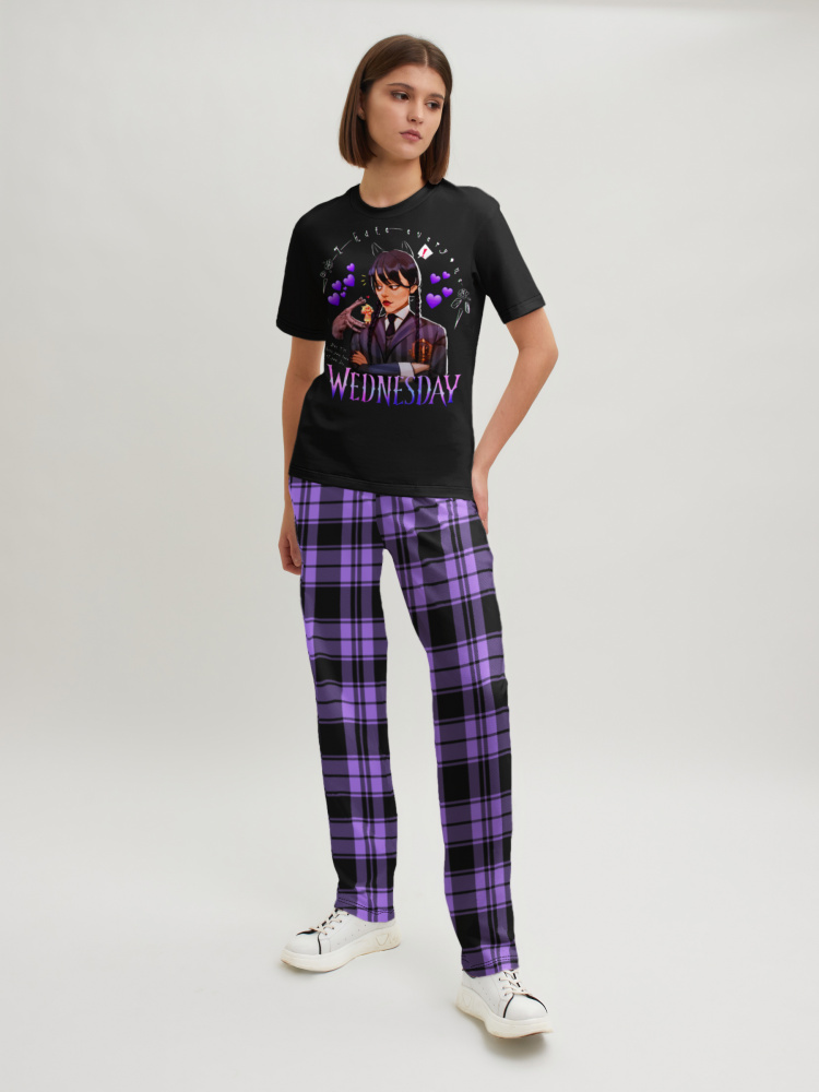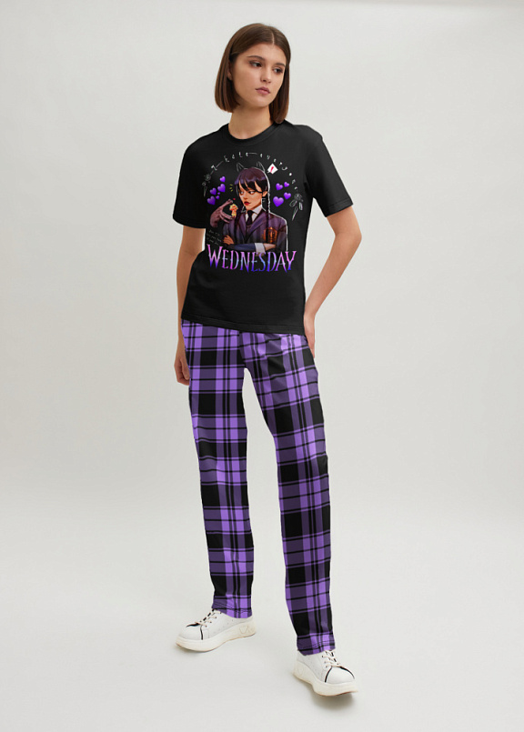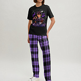 Стильный комплект из хлопка c оригинальным тематическим принтом. Состоит из футболки и брюк прямого фасона. Комплект можно использовать как домашний костюм или пижаму.Мягкий хлопок обладает приятными тактильными свойствами, а яркий принт совершенно не ощутим, благодаря уникальной технологии печати по ткани. Все используемые краски для печати принта безопасные и экологичные и позволяют ткани дышать.